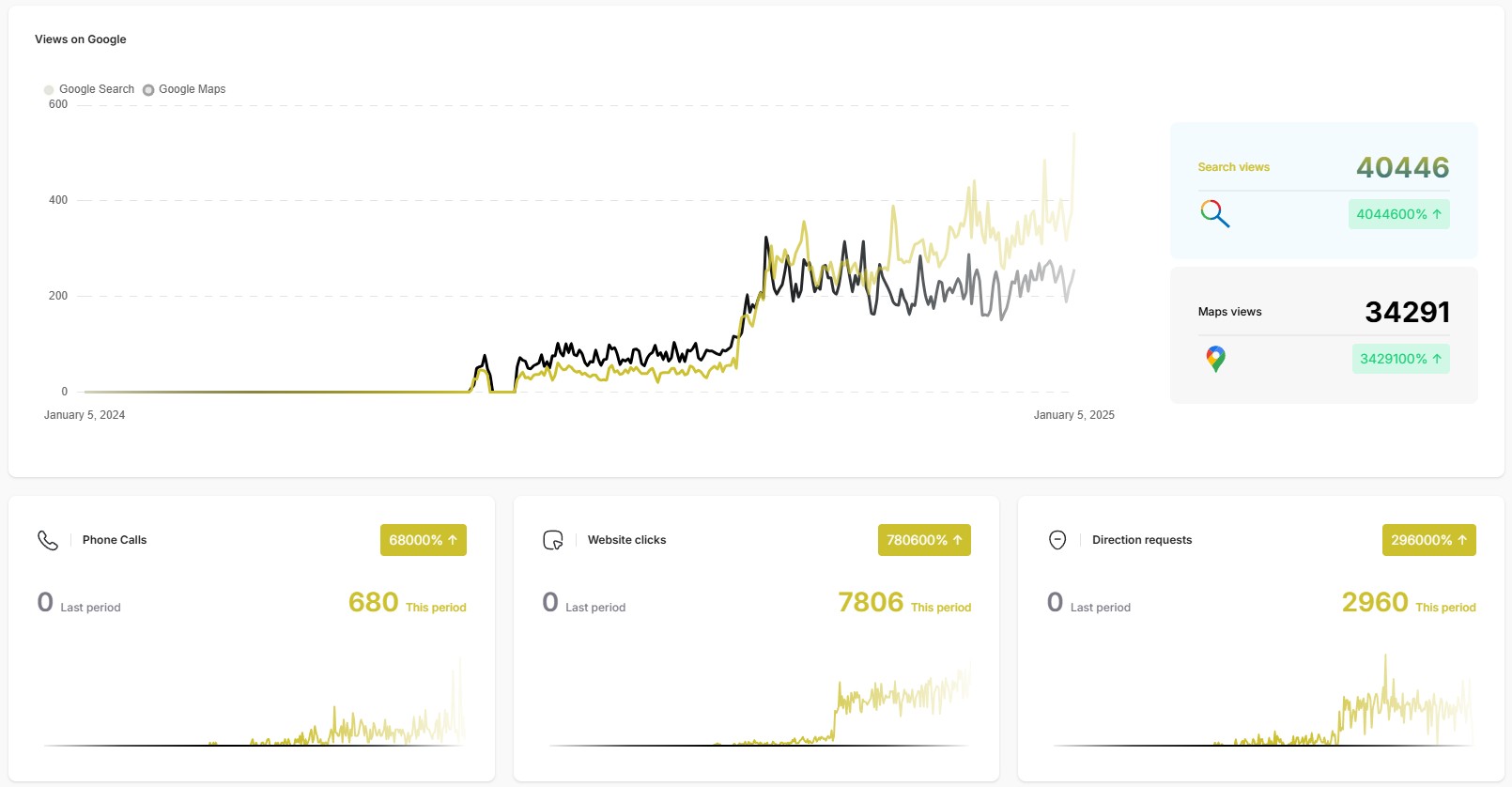 - Direction Requests: Rose 296000% (from 43 to 2960 requests).